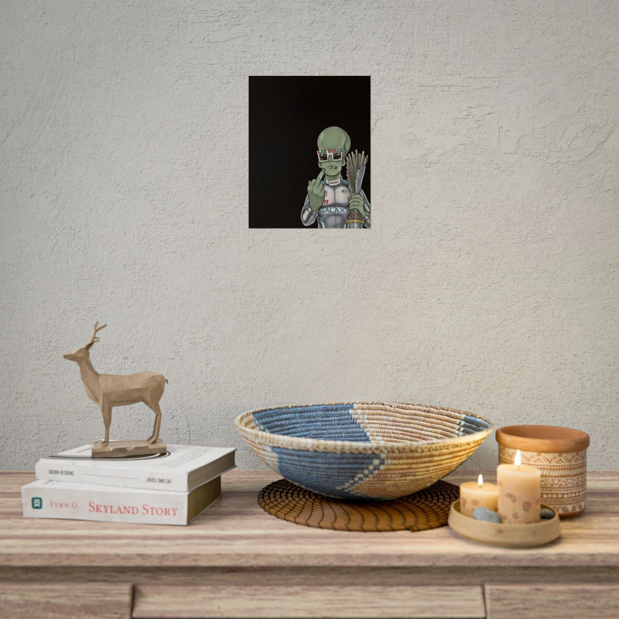 A bold, edgy art poster that brings attitude and color to any wall. The print shows a cool, green-skinned character in a retro-futuristic racing suit, sunglasses spelling out a playful message, and a hand full of vibrant pencils — all set against a deep black background that makes the colors pop. This poster feels like a wink from the underground: humorous, unapologetic, and lively. It works as a focal piece above a desk, in a studio, or layered into an eclectic gallery wall. Choose Matte, Semi-Glossy, or Fine Art paper to match the look you want — textured and painterly, crisp satin, or bright photographic detail. Available in multiple sizes and orientations so it fits your space and vibe.