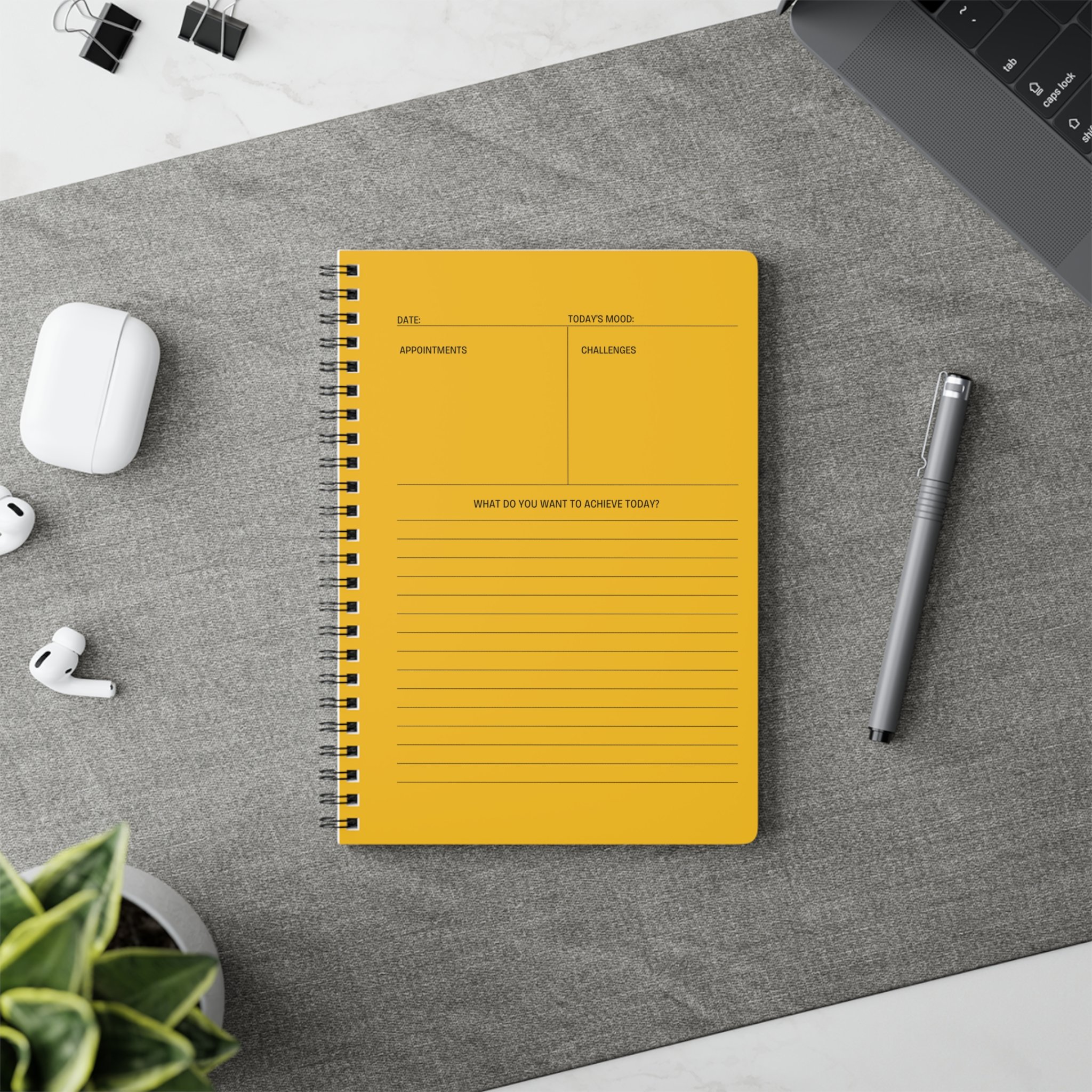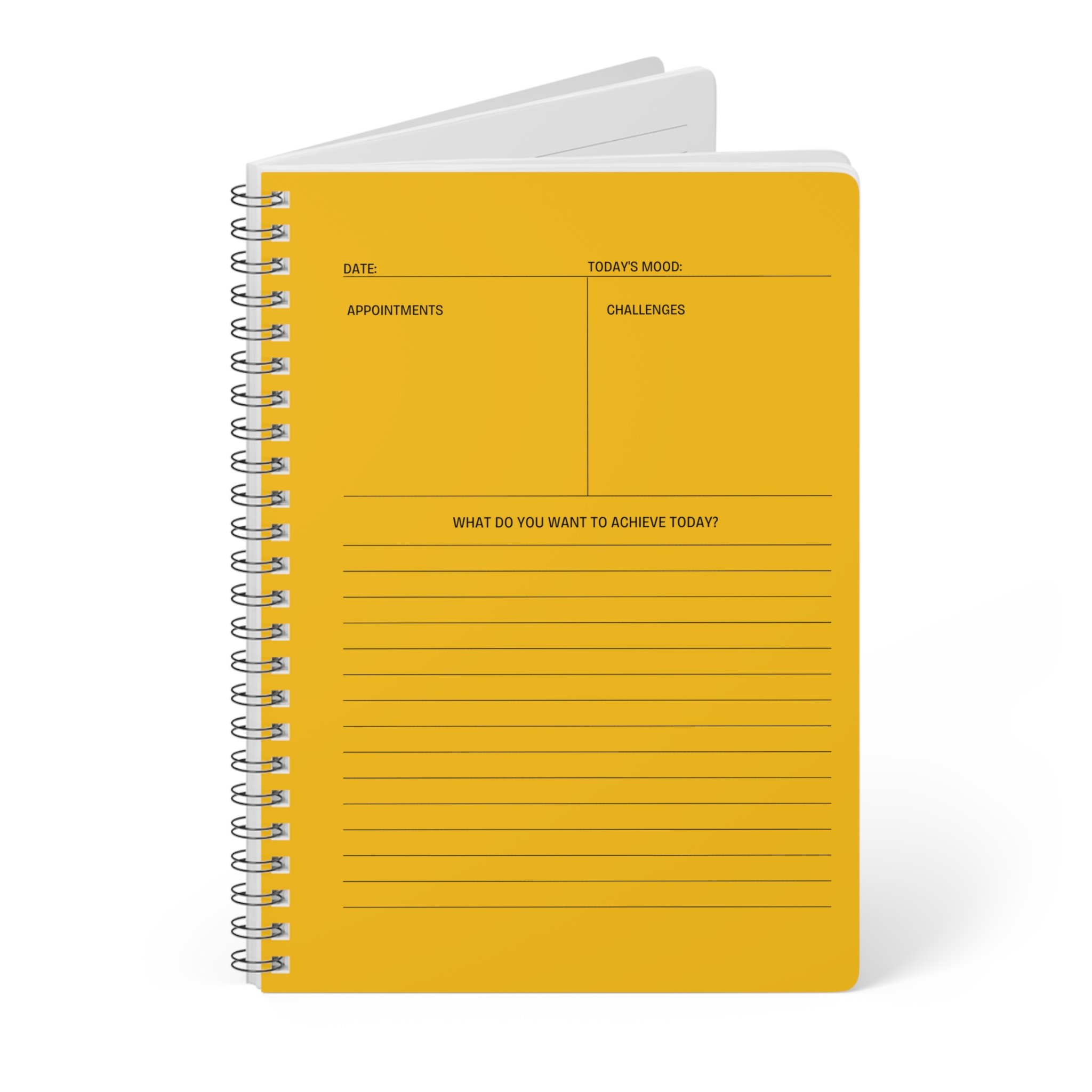 This A5 wirebound notebook is built for focused days and steady routines. The glossy, rounded cover and sturdy black wire-o binding lay flat so your pen never catches. Inside, 150 lined pages of smooth 90gsm paper (sourced from Austria) invite deliberate handwriting, while the structured daily layout on the front page — with spots for date, mood, appointments, challenges, and a lined section headed “What do you want to achieve today?” — turns vague intentions into clear actions. Bright, true-to-design printing gives the cover a lively, confident look that stands out on a desk, in a bag, or beside a morning coffee. Practical touches like a white back cover and a small inner barcode keep the aesthetic clean and functional.