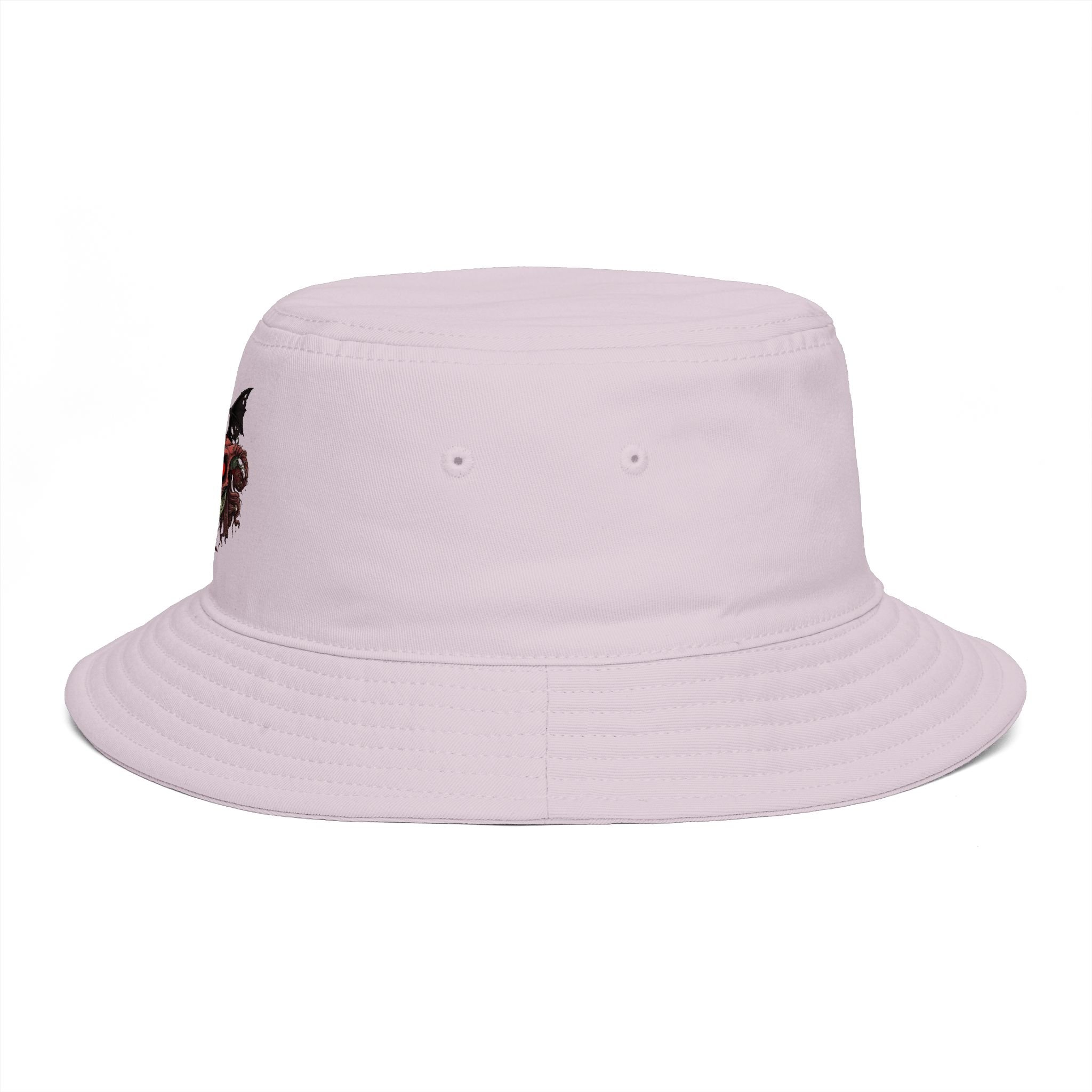 This lightweight cotton bucket hat features bold front embroidery inspired by dark fantasy — ram horns, bat wings, and a crimson jewel-like centerpiece that gives just enough occult energy without summoning anything (probably).