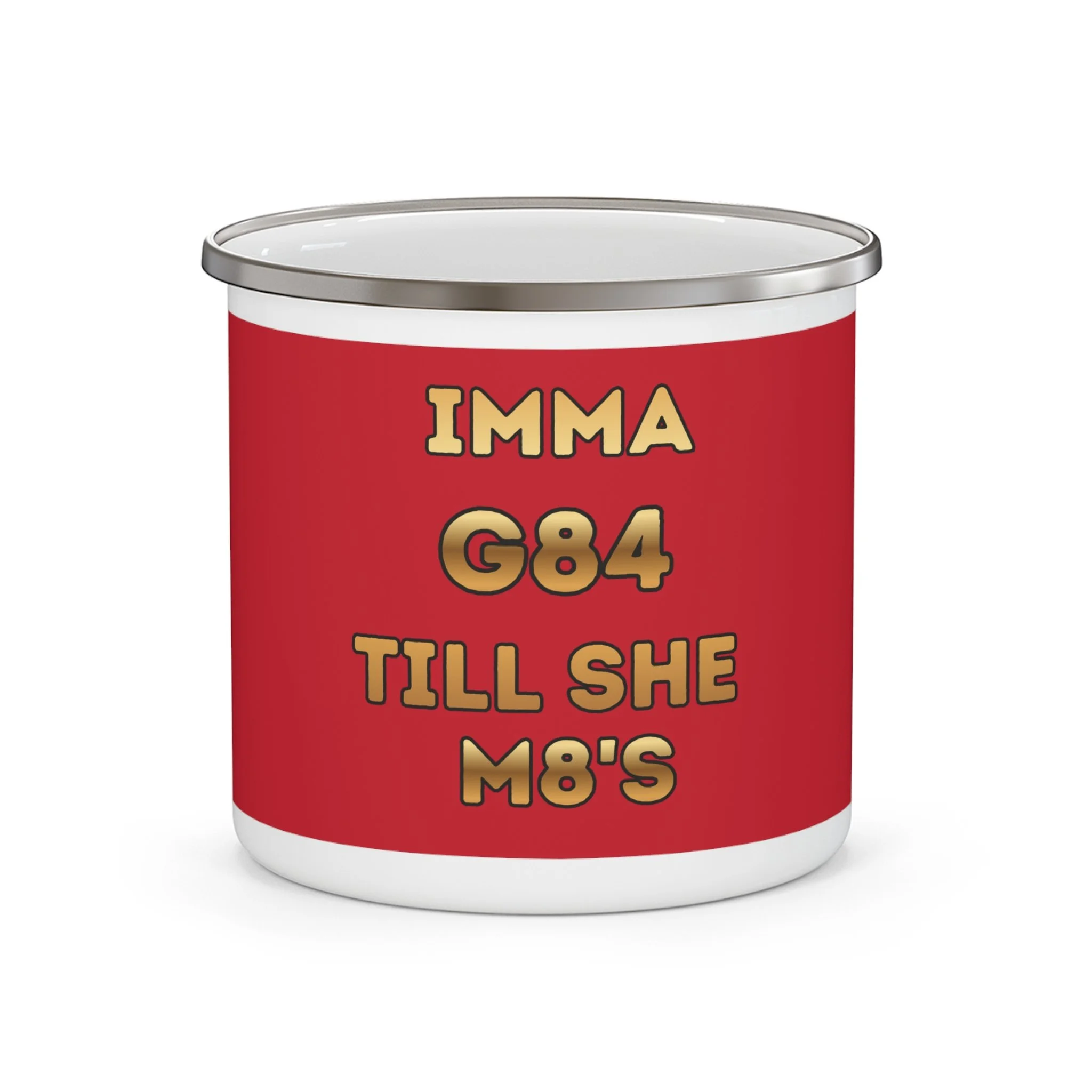 Enamel Mug — “Imma G84 Till She M8’s” Camping Coffee Cup with Cheeky Attitude