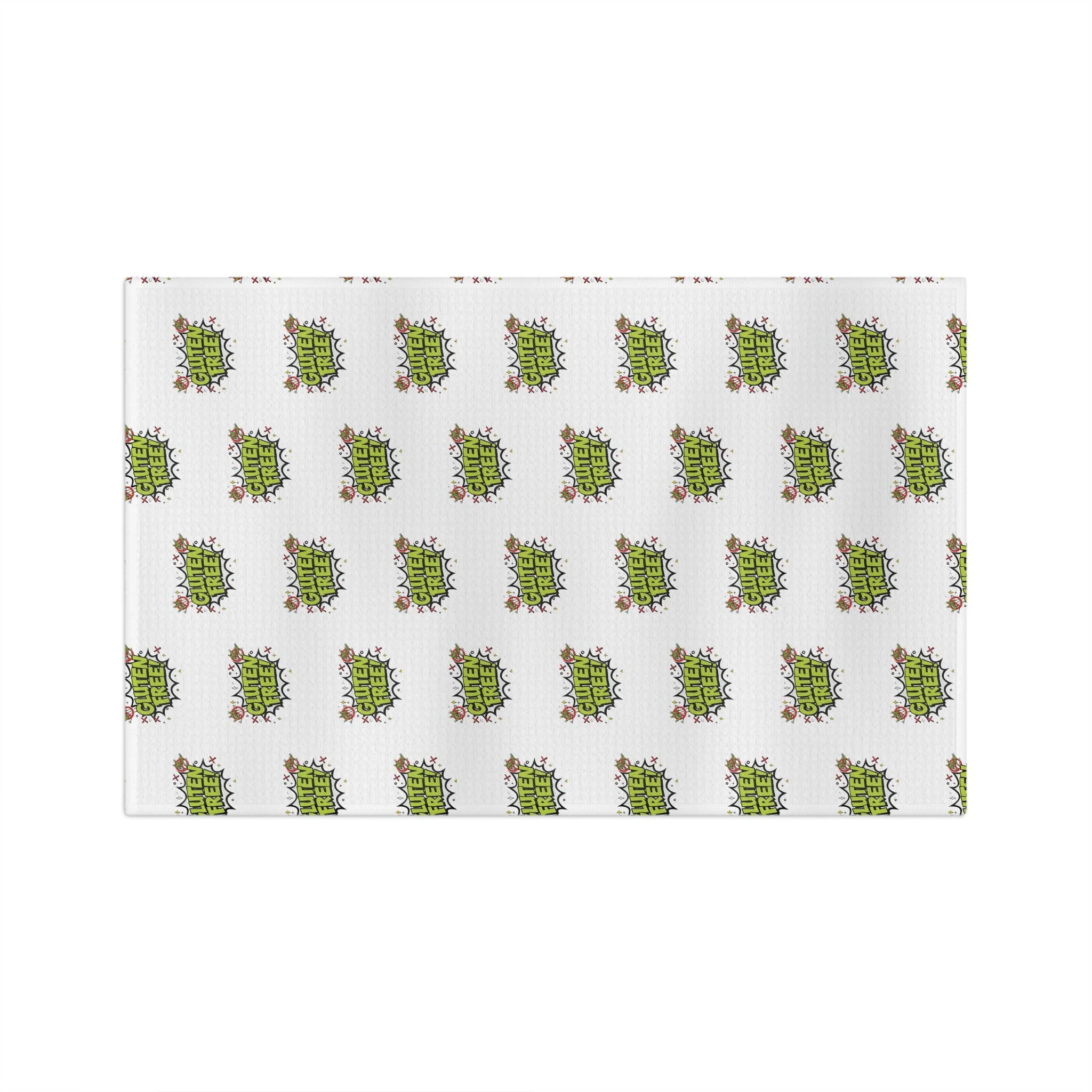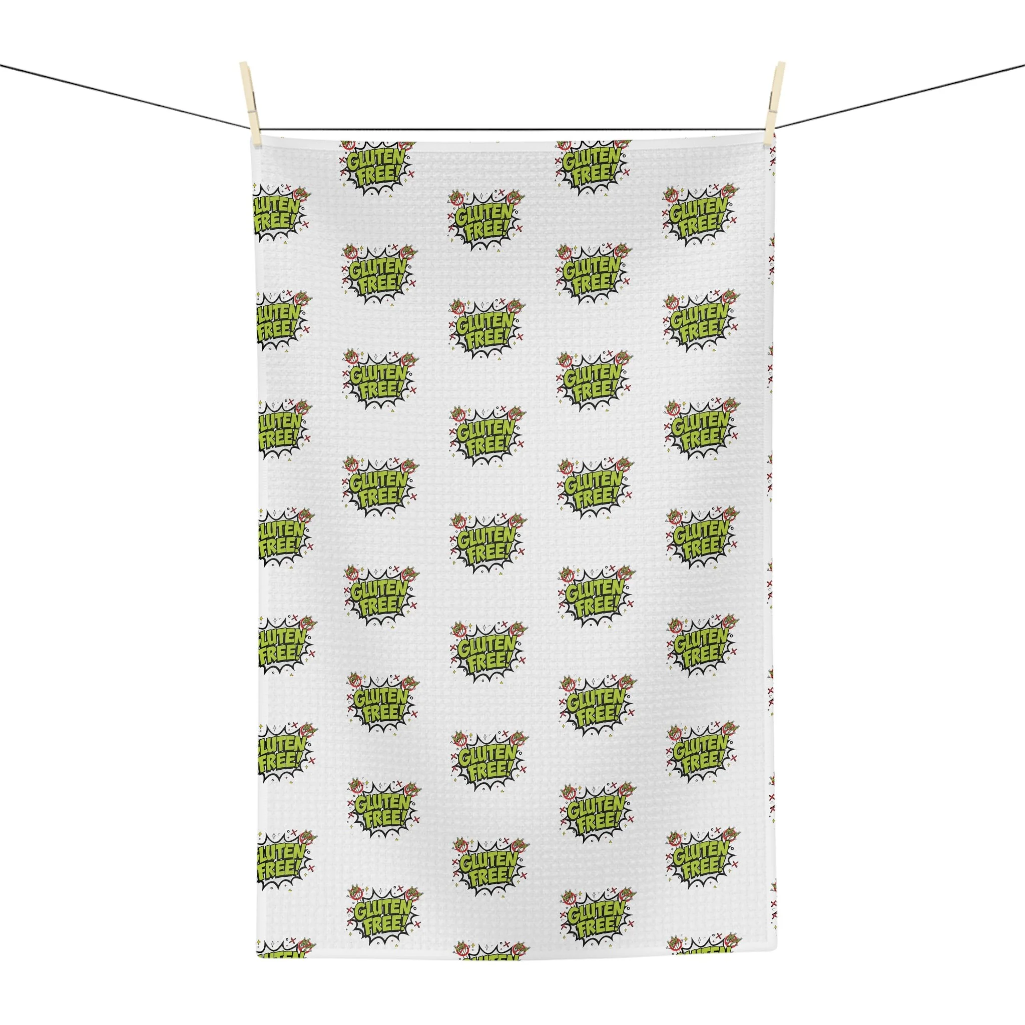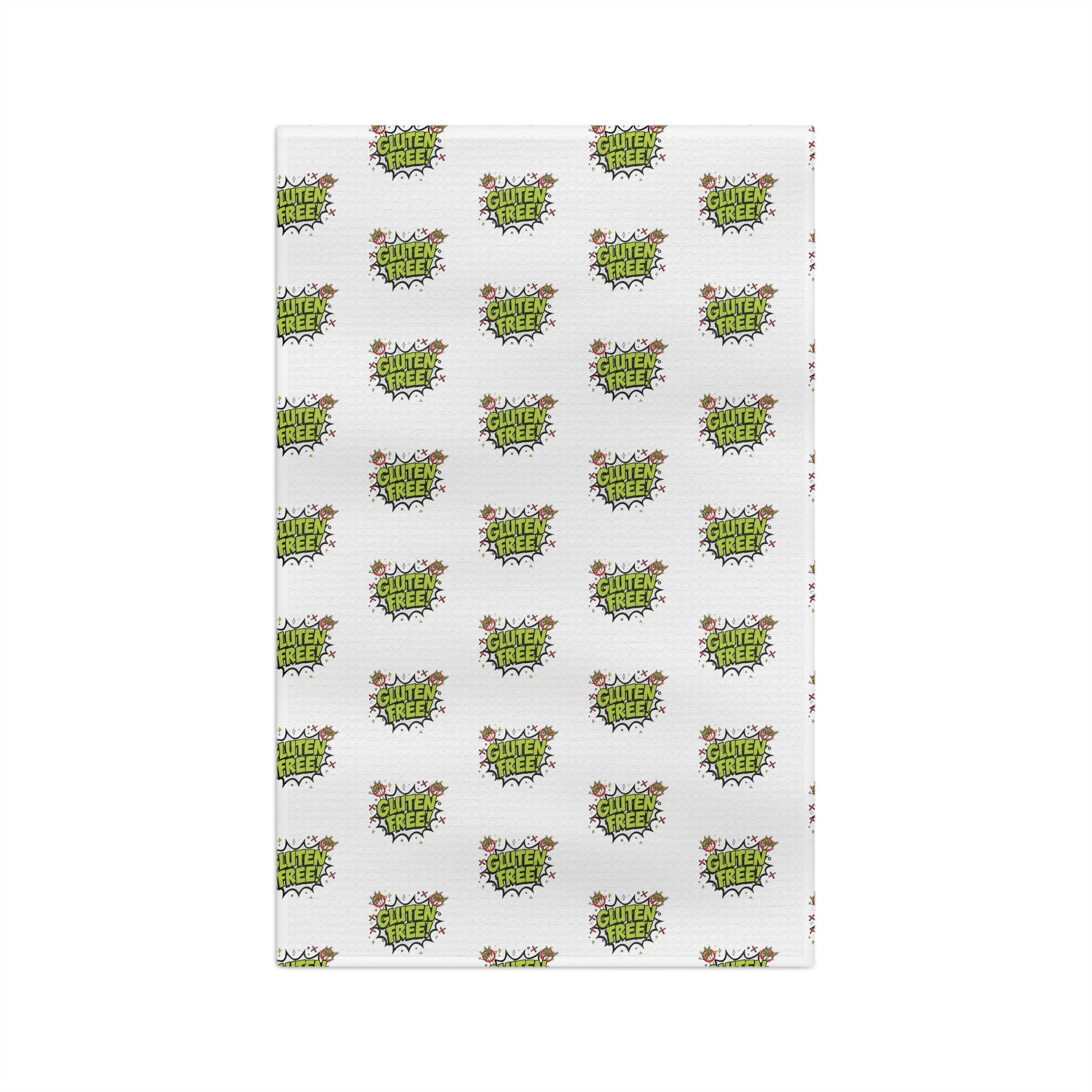 A bright, playful microfiber tea towel printed all over with a repeating ‘gluten free’ pop-art badge. Soft, quick-drying microfiber fibers wick away spills and dry fast, so this towel keeps its lively print fresh through daily use. Its hemmed edges and sewn-in care label give it a finished, durable feel that holds up in a busy kitchen. The compact 16" × 25" size is easy to drape over a handle, tuck beside a prep station, or roll into a gift basket celebrating special dietary choices or pantry pride.