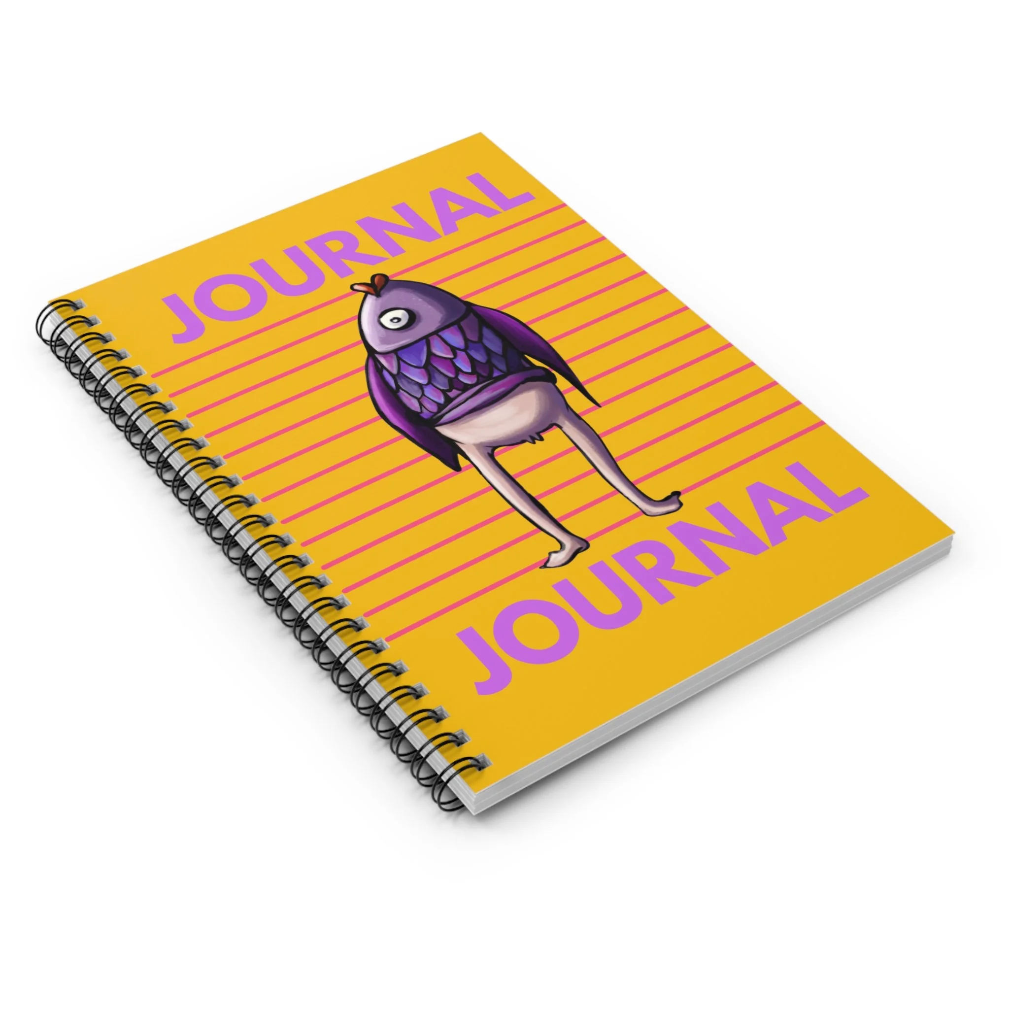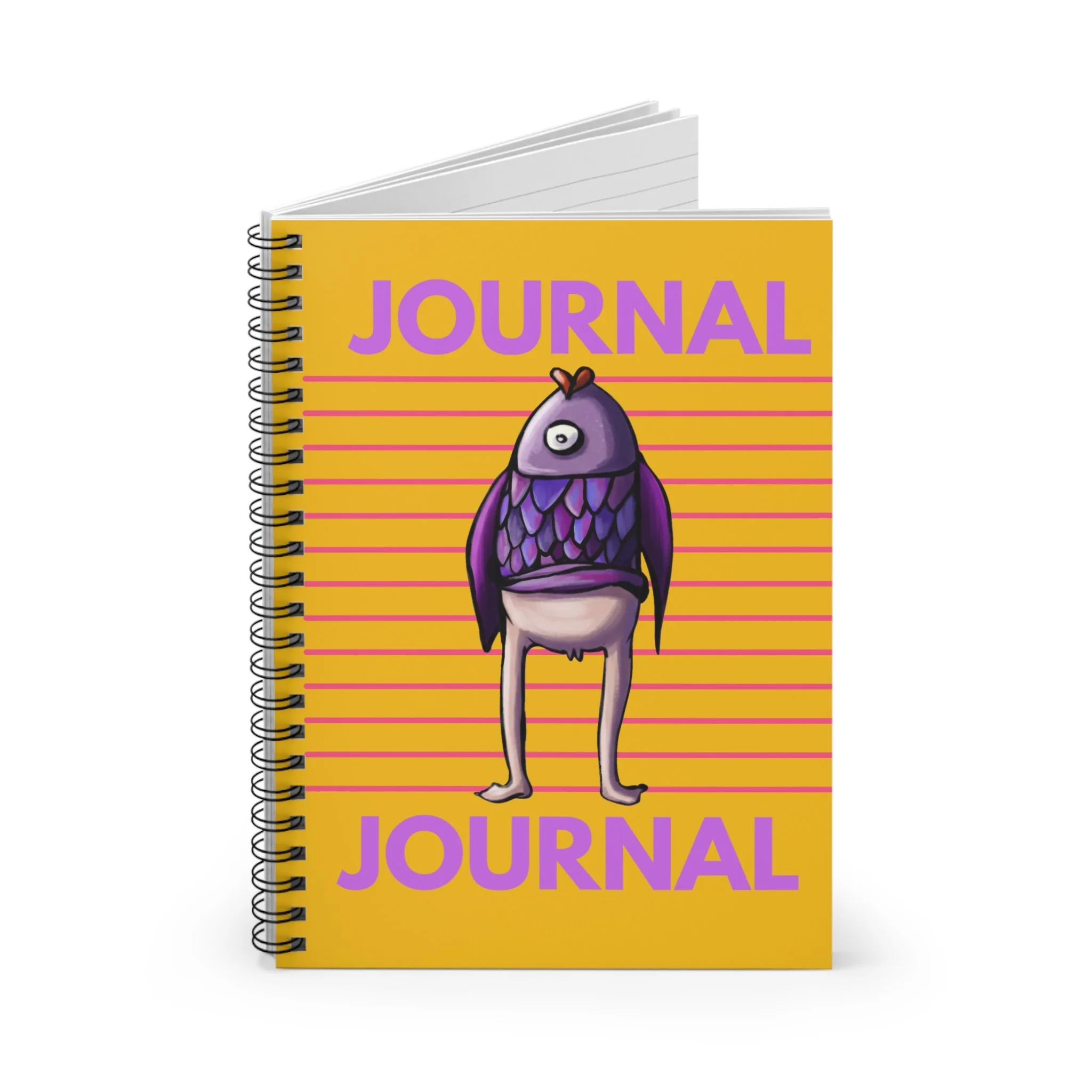 This bright, ruled spiral notebook brings a burst of personality to everyday writing. The front features a whimsical one-eyed purple creature standing against warm orange-and-pink stripes with bold “JOURNAL” lettering top and bottom — playful, slightly surreal, and impossible to ignore. Inside are 118 ruled pages of smooth 90gsm paper that take pen and pencil comfortably, plus a discreet document pocket tucked into the inside back cover for receipts, notes, or loose sketches. The metal spiral binding lies flat for comfortable writing and makes page removal clean and simple. At 6" x 8", it slips easily into backpacks or tote bags and stands out on any desk when you need a spark of color or a moment of creative silliness.