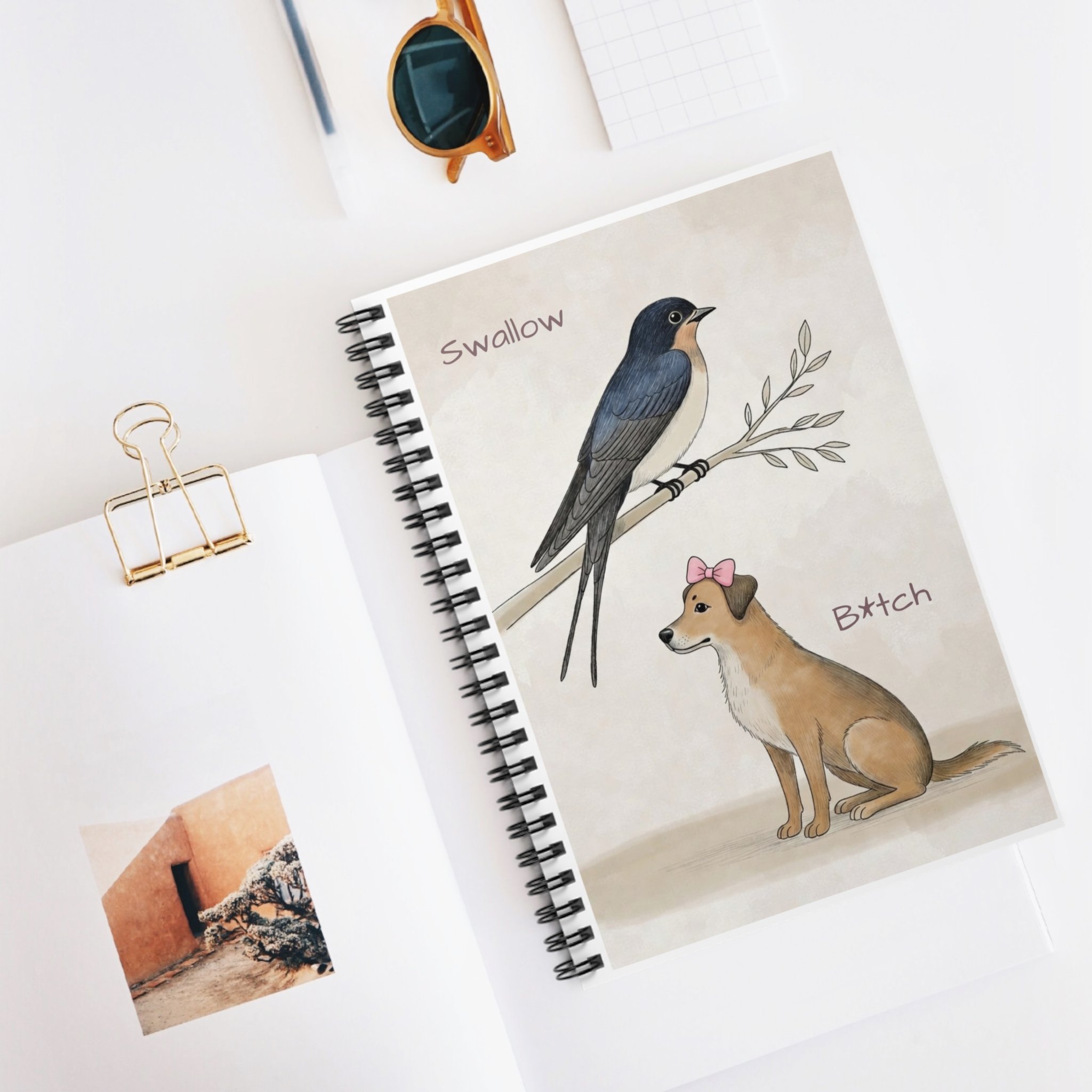 Swallow & Dog Illustrated Spiral Notebook — Ruled Journal with Whimsical "Swallow B*tch" Design